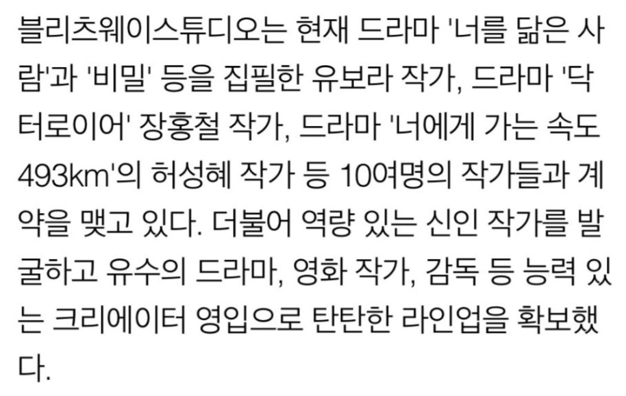 배우 전문 매니지먼트 에이치앤드 엔터테인먼트를 인수 합병한 블리츠웨이에는 배우 고두심, 주지훈, 정려원, 인교진, 소이현, 천우희, 우도환, 윤박, 정인선, 곽동연 등 대중적인 사랑을 받고 있는 연기파 배우들이 다수 소속되어 있다.