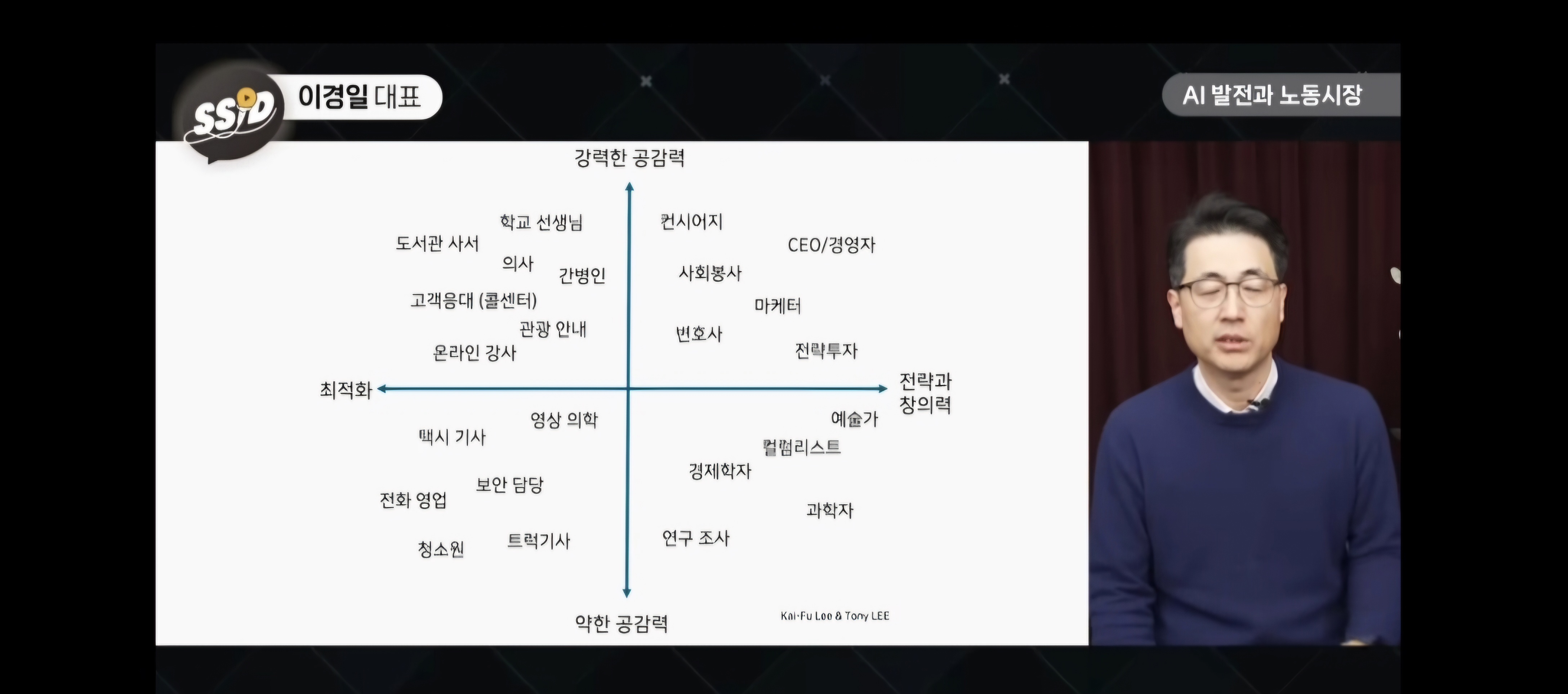 예술의 경우는 특히 음악이랑 문학은 AI로 대체 불가. 얘네는 최빈치를 찾아가기 때문에 나오는 산출물이 식상해서 샘플링으로나 쓰는거지. 사람을 감동시키는 건 사람의 예술감각이야.